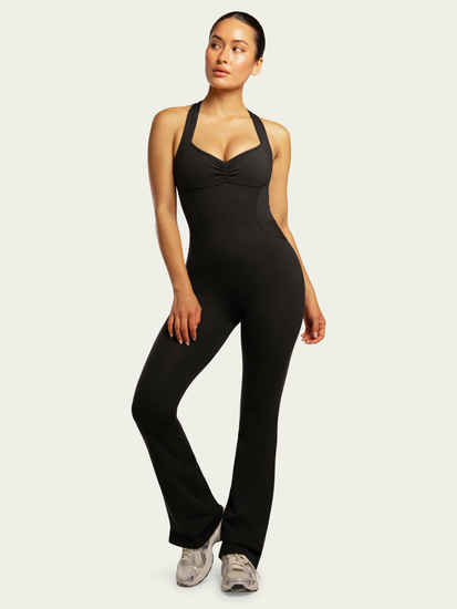 - Open back, full length, flare leg onesie with removable padding